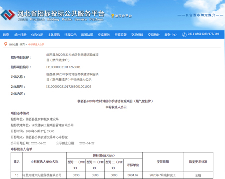 日前,河北省招標投標公共服務平臺網發布了“臨西縣2020年農村地區冬季清潔取暖項目”公告中,光源春壁掛爐成功中標。