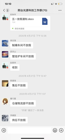 “五.一”前的4月27日,光源太陽能科技公司下發了“五.一”放假的通知。通知說:“經公司領導研究決定,自2020年5月1日——2020年5月5日(“五.一”國際勞動節)放假五天。”